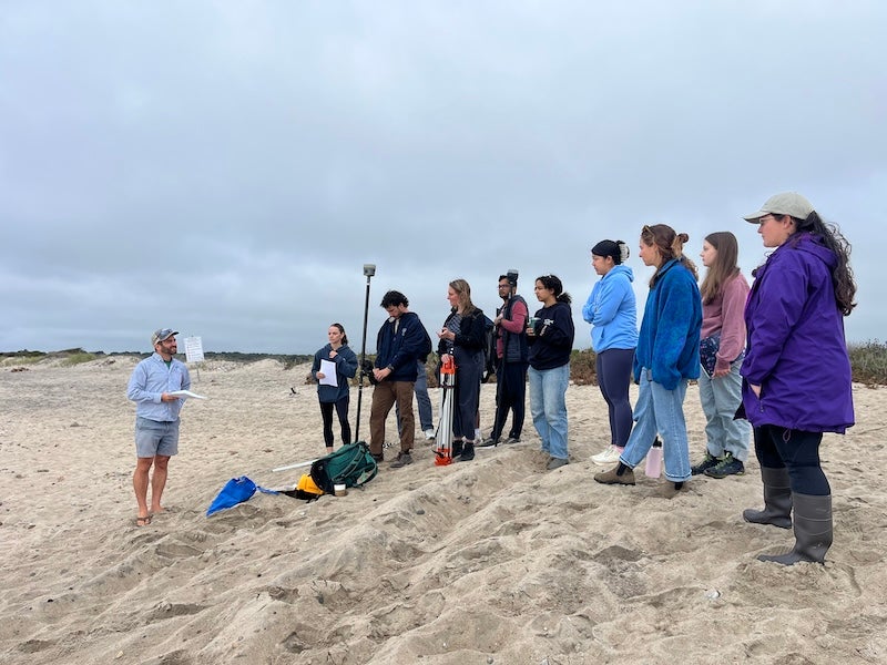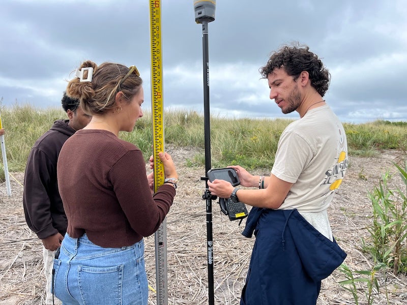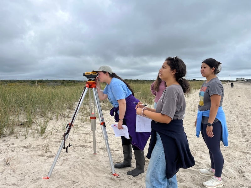 To tie concepts learned in class to real-world scenarios, Russoniello has several field trips planned. The first field trip to Moonstone Beach, for example, demonstrated how beach profile changes over time. Students discussed impacts of storms and sea level rise, and gained hands-on experience mapping beach profiles. Using auto levels and high-precision GPS instruments, students took elevation measurements across a transect, which ran from the shore, up over the dunes, and back down to the salt marsh behind the dunes. This exercise gave the class a snapshot of the work done by URI’s COAST Lab, which has been monitoring the morphology of Moonstone Beach using similar methods since the 1960s. By comparing these elevation profiles over time, the COAST Lab is able to visualize how rising sea levels and intense storms are changing the shape and location of the shore and dunes.