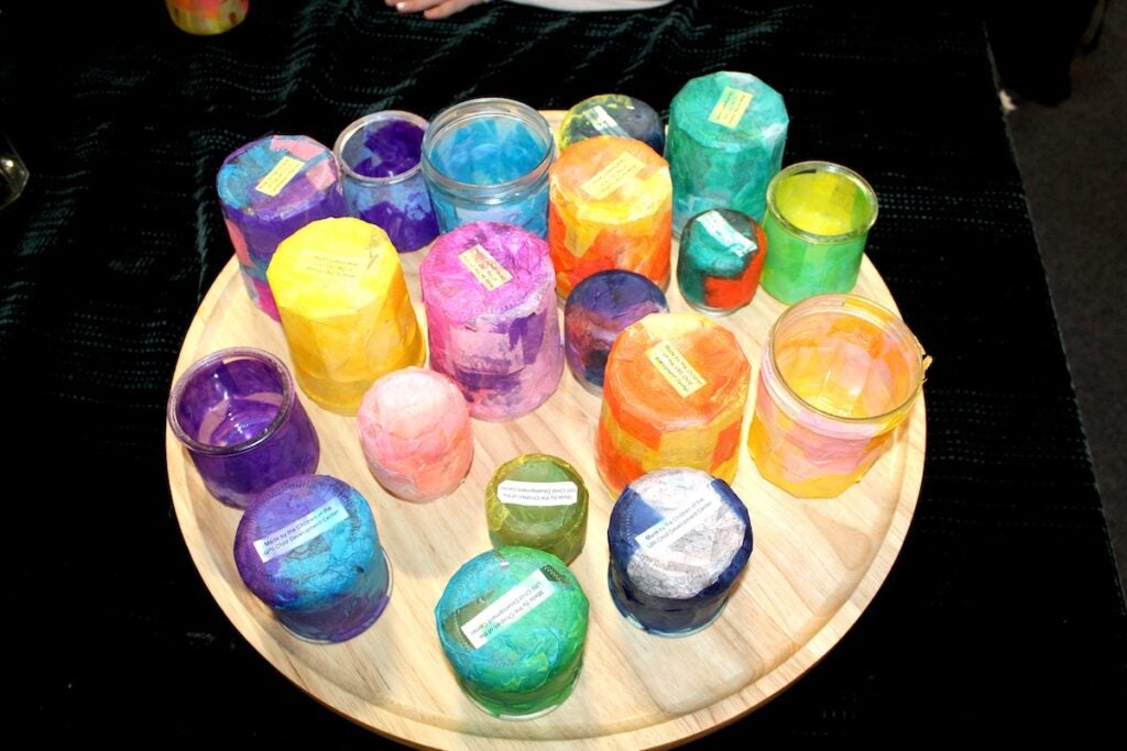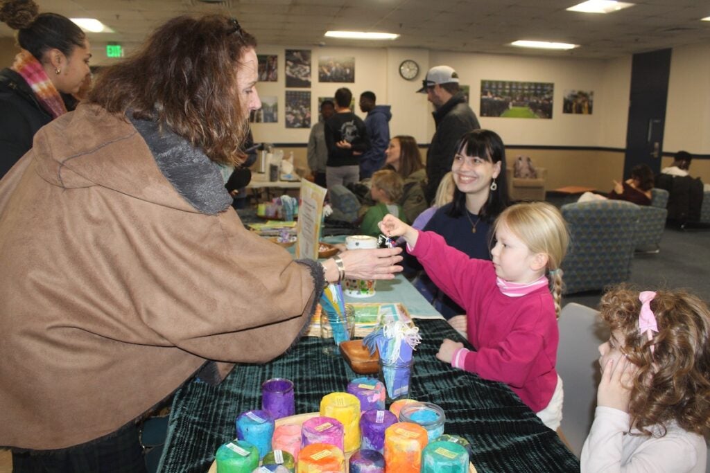 The preschoolers, ages three to five, interacted with passers-by in the Memorial Union lobby, asking them to donate to the food bank in exchange for a one-of-a-kind, handmade gift. The students spent weeks creating colorful bookmarks, candle holders, postcards, shoelaces, and key chains, which they handed out in exchange for donations of cash or non-perishable food items.