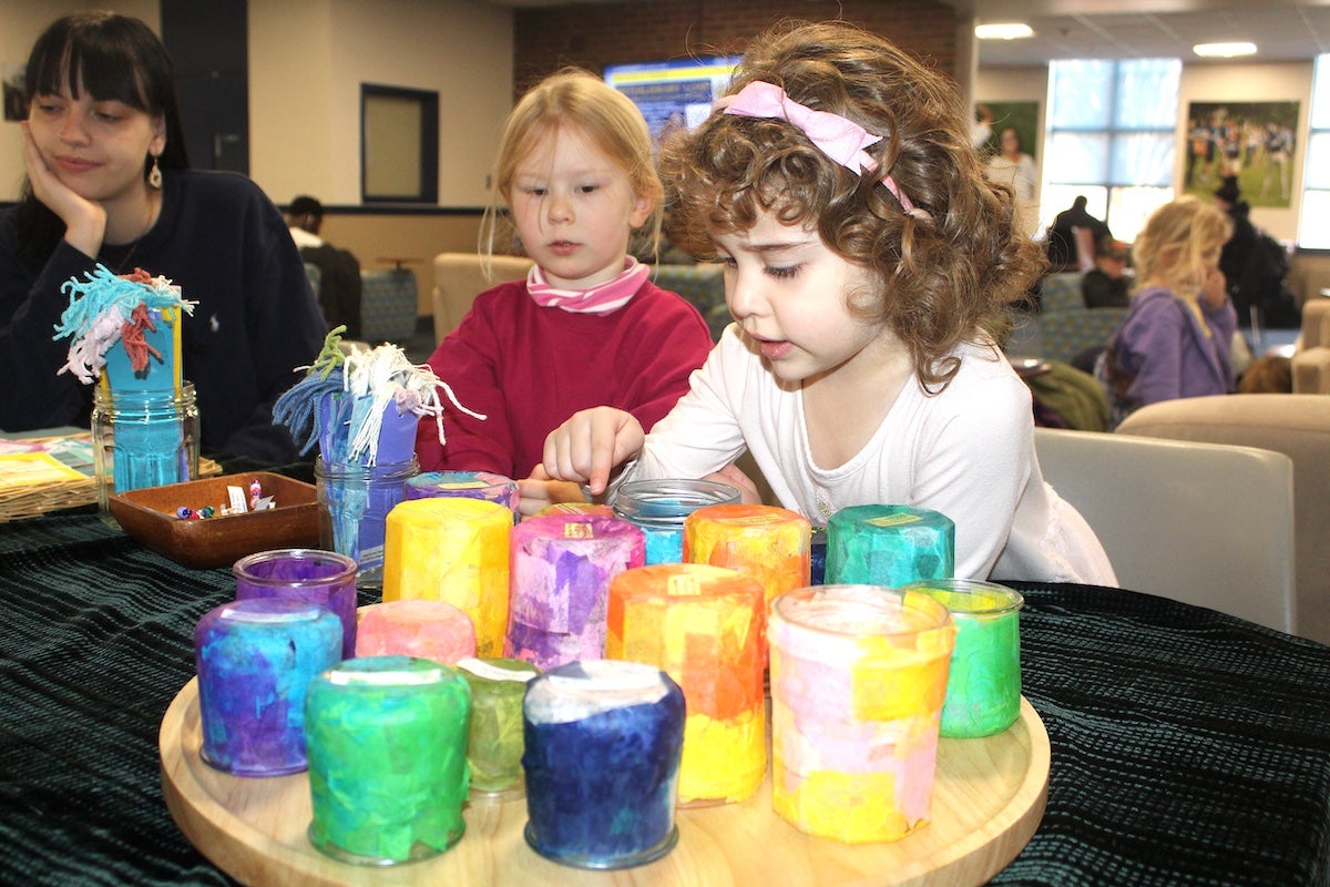 The preschoolers, ages three to five, interacted with passers-by in the Memorial Union lobby, asking them to donate to the food bank in exchange for a one-of-a-kind, handmade gift. The students spent weeks creating colorful bookmarks, candle holders, postcards, shoelaces, and key chains, which they handed out in exchange for donations of cash or non-perishable food items.