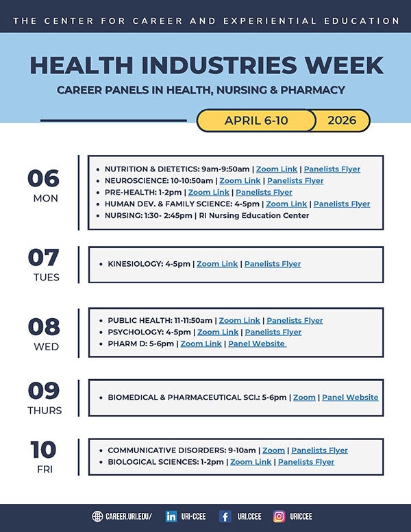 Health Industries Week is next week where 46 alumni from College of Health Sciences, College of Pharmacy, College of Nursing and College of Environment & Life Sciences share their career journeys since leaving URI, advice for you as you enter the field and showcase the variety in which you can apply your degree after graduation!