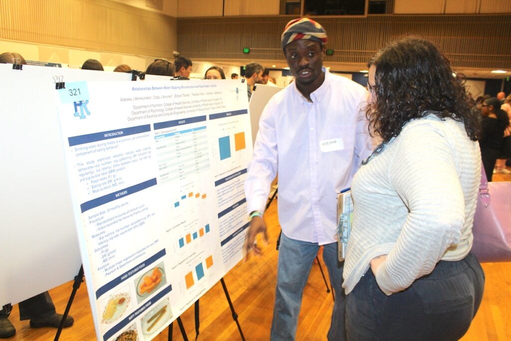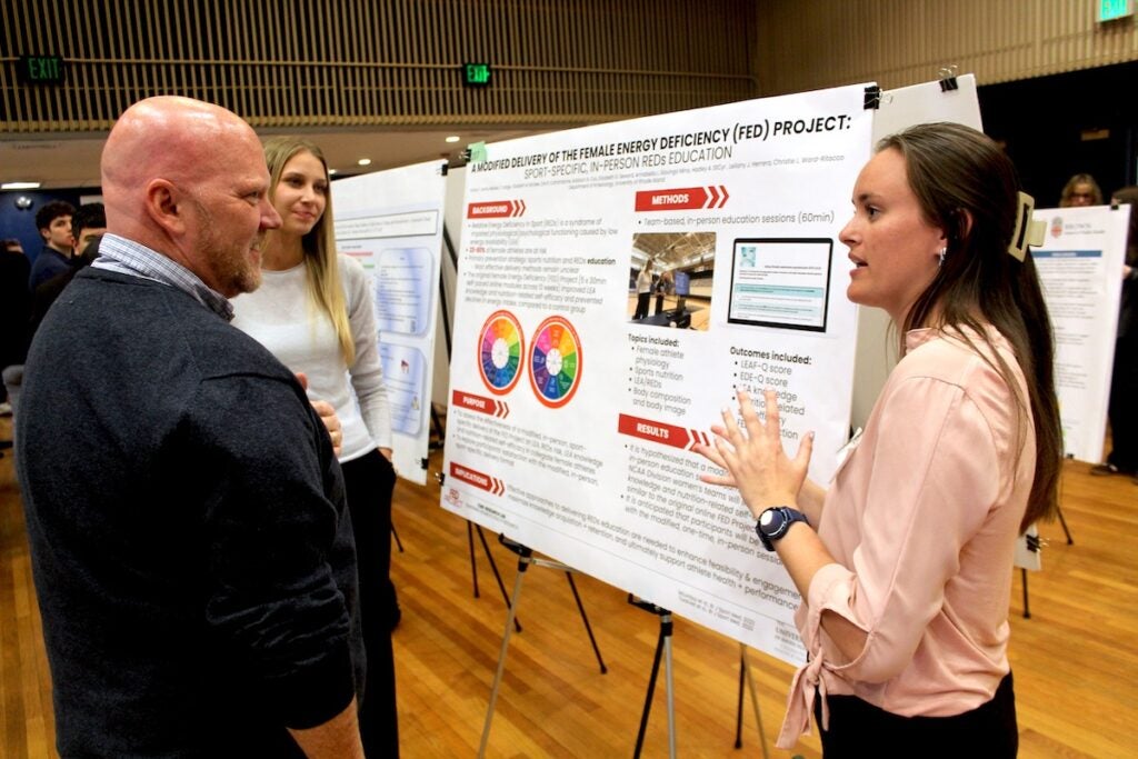 Undergraduate and master’s degree students, as well as Ph.D. candidates from all of the college’s academic programs displayed their research posters in the Memorial Union ballroom and discussed their studies with university and college executives, and with health sciences faculty members who judged their presentations. In 83 presented projects, students studied such diverse topics as autism, diabetes, intimate partner violence, psychological resilience, eye-tracking technology to evaluate reading performance among children, wearable sensors after knee surgery, alcohol and cannabis use, and many more.