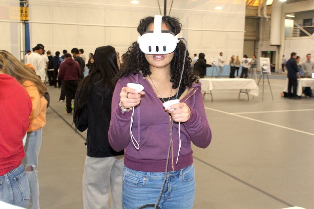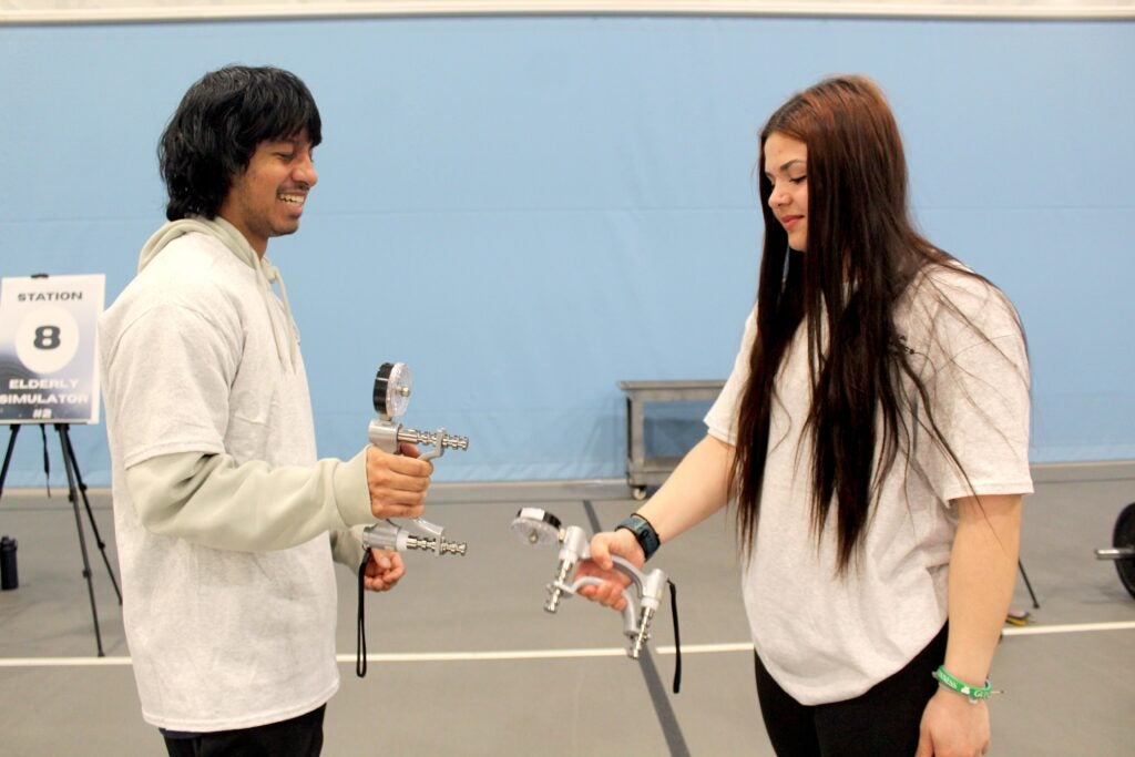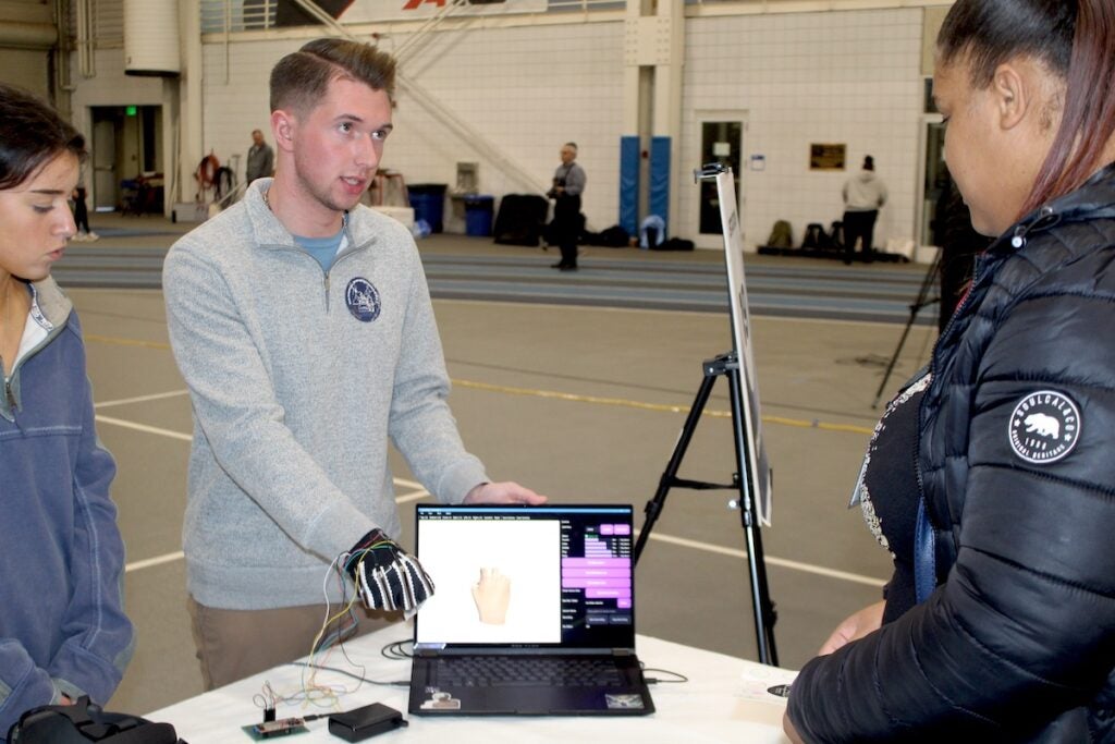 Students tested their jumping ability, sprint speed, grip strength and dead lift ability. They sampled motion capture technology to watch their bodies’ movements on a computer screen; wore a weight vest, cataract simulation glasses, and knee braces to get a sense of what it feels like to move as an older person; and stood on force plates to test their balance and determine the amount of force they put on their feet. Virtual reality and augmented reality gaming systems taught the students how such equipment is used in motor skills rehabilitation; and biomedical engineering students displayed a high-tech glove they designed that connects to a computer to show how the hand and fingers move.
