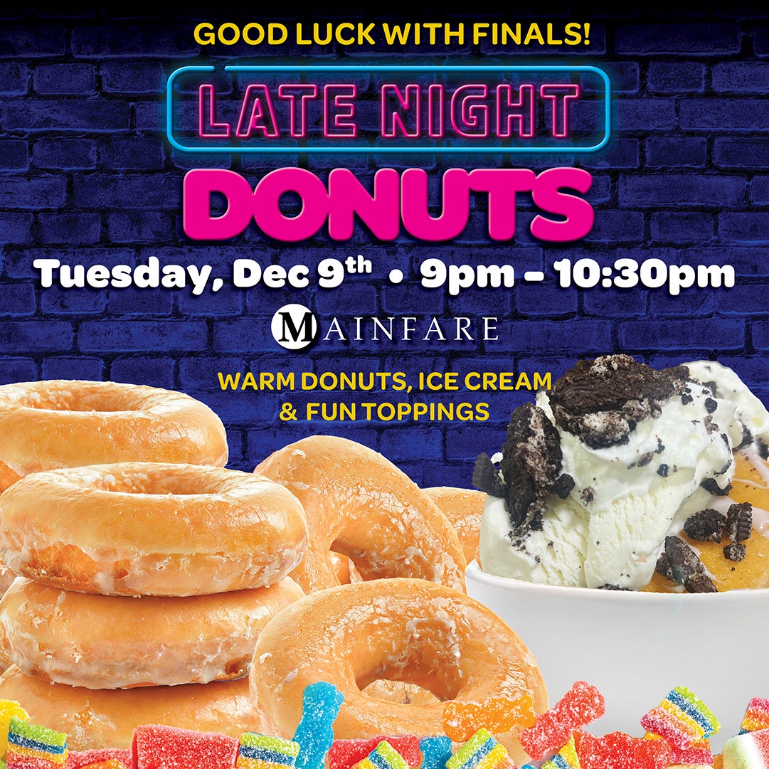 Get a pick-me-up before finals at Mainfare Dining Hall with a special treat of warm donuts, ice cream and fun toppings!