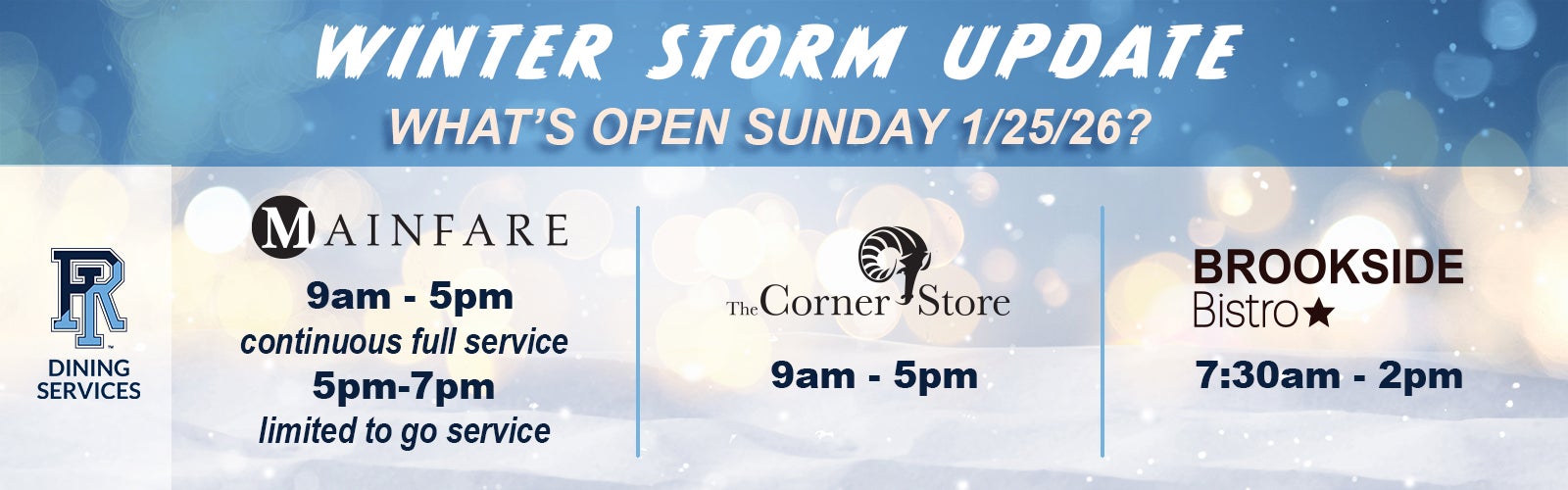 Locations Winter Storm UpdateSUNDAY, JANUARY 25th Dining Hours for Spring 2026starting January 21st MainfareHOURS AND MORE ButterfieldHOURS AND MORE Rams DenHOURS AND MORE Astros Late NightHOURS AND MORE Brookside BistroHOURS AND MORE Daily GrindHOURS AND MORE Gertz Cafehours and more The Corner Storehours and more Snack Denhours and more Rhody Eatzplan your event TC Programlearn more CateringPLAN YOUR EVENT