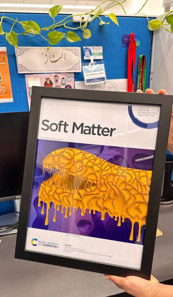 During her time at URI, she has had three papers published in multiple leading journals. Soft Matter even featured her paper, “Elucidating the Role of Physicochemical Interactions on Gel Rheology” on the journal’s cover. “Publishing my first paper was another unforgettable moment,” said Nikoumanesh. “I also really enjoyed mentoring undergraduate students and watching them grow as researchers. Overall, as one of the first Ph.D. students working with Dr. Poling-Skutvik, it has been exciting to see the lab grow and to be part of that journey.”
