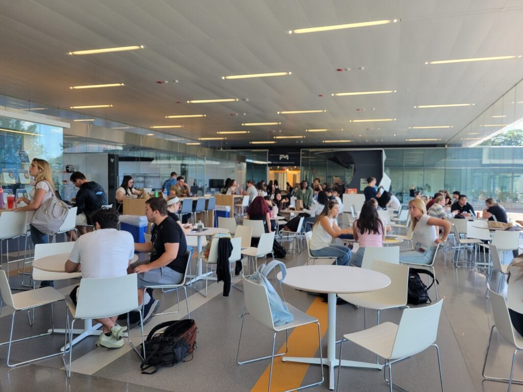 Toray Commons, located on the main floor of the Fascitelli Center for Advanced Engineering, also features dozens of round tables and serves as a central hub for student activity. Surrounded by glass and filled with natural light, it’s a favorite spot for studying between classes, meeting with classmates, or grabbing coffee from the on-site Starbucks. Adjacent to the Ideation and Innovation Studio and senior capstone design labs, Toray Commons is a vibrant and active space within the college. To reserve this space for events, please have a faculty or staff member fill out the reservation request form.