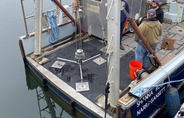 Deploying a shallow water piston corer in Narragansett Bay.