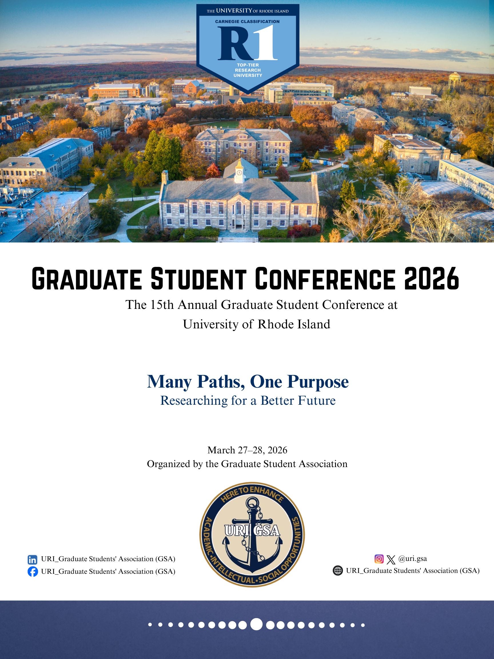 On behalf of the organizing committee, it is our great pleasure to welcome you to the URI Graduate Student Conference 2025 (Gradcon 2025) hosted by the University of Rhode Island, Kingston, Rhode Island. The URI Graduate Conference began in 2007 with a small group of graduate students from the URI English Department. Since 2007, URI Gradcon has totaled over 500 students including those from universities and colleges all over the nation—and world. With a rich history of showcasing innovative research projects, this conference continues to serve as a platform for academics, researchers, and practitioners to exchange ideas, present innovative findings, and foster collaborations in a wide range of topics.