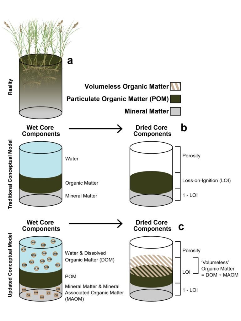 Conceptual framework illustrating core components in (a) reality, (b) traditional calculations, and (c) the researchers updated calculations, which separate measured organic matter (LOI) from volumeless organic matter, composed of dissolved organic matter (DOM) and mineral-associated organic matter (MAOM).