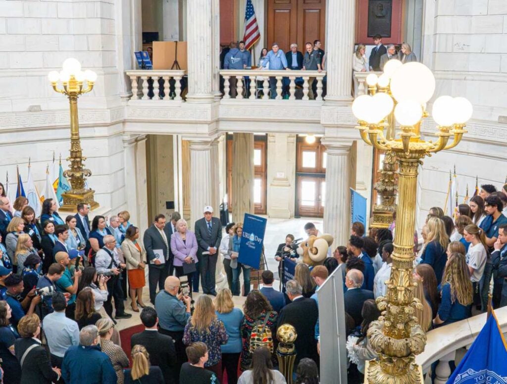 Keaney Blue was on full display in, around and above the Rhode Island capitol last week as dozens of state leaders and hundreds of University of Rhode Island students, faculty, and staff celebrated the University’s success and impact during URI Day at the State House in Providence.