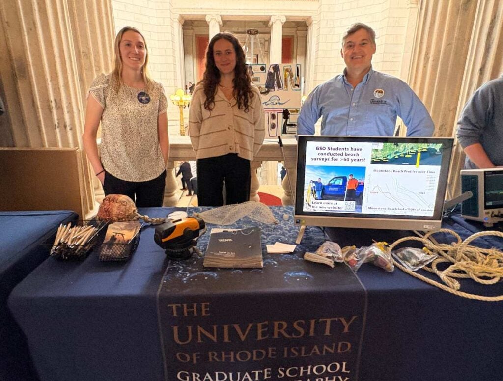 Representing GSO, members of J.P. Walsh’s COAST Lab shared research with clear local relevance, including work on microplastics and long-term beach monitoring. Researcher Victoria Fulfer, Ph.D. ’24, and Professor Walsh recently published a study documenting the exponential rise of microplastic pollution in Narragansett Bay since the 1940s. Using sediment cores collected throughout the Bay and Rhode Island Sound, the team estimates that 2,300–3,000 tonnes of microplastics have accumulated in seabed sediments over the past century. The group also highlighted URI’s Beach Survey Program, which tracks changes along sandy shorelines on Rhode Island’s south coast—data that is critical for understanding erosion and coastal dynamics.