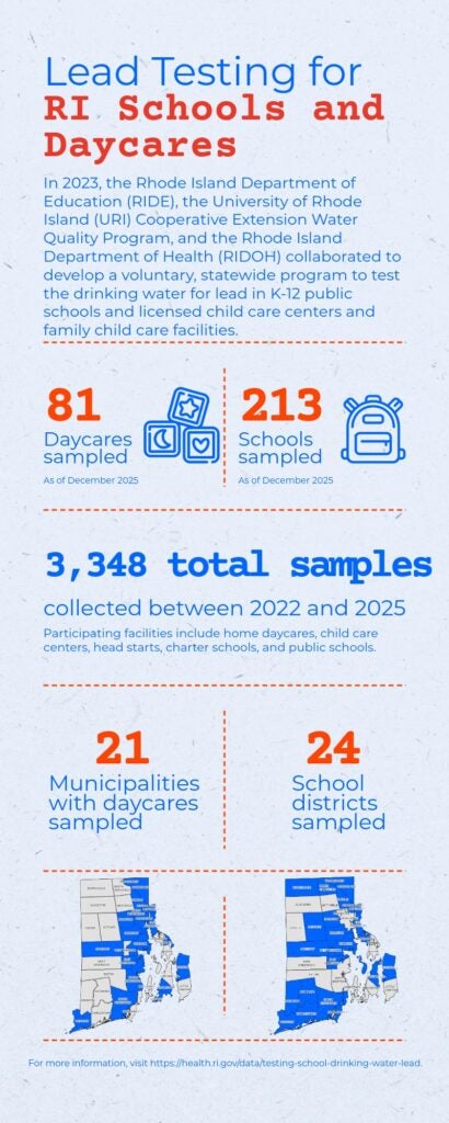 The Water Infrastructure Improvements for the Nation Act (WIIN Act) addresses, supports, and improves America’s drinking water infrastructure, and federal grant funds from the WIIN Act have been used to develop a program to test drinking water for lead at Rhode Island schools. This program is a collaboration between the URI Cooperative Extension Water Quality Program, the RI Department of Health (RIDOH), and the RI Department of Education (RIDE).