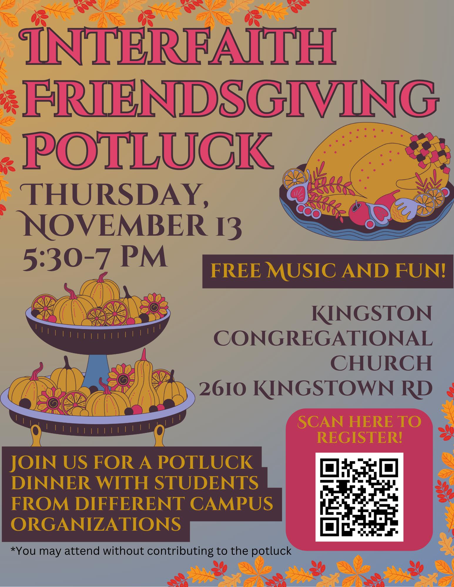 Join us for an Interfaith Friendsgiving Potluck at Kingston Congregational Church on Thursday, November 13, from 5:30 to 7 PM. Enjoy an evening of food, community, and live music with students from different campus organizations. All are welcome – you may attend with or without contributing to the potluck.