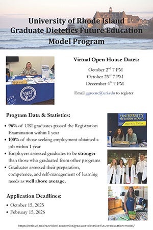 In accordance with the 2019 Reauthorization of the Higher Education Act, URI hereby discloses that the curriculum for this program meets the educational requirements for licensure as a Registered Dietitian in all U.S. States and Territories. The applicable licensing board in these states may impose additional requirements* on candidates prior to granting a license (e.g., passing of an exam; completing a post-baccalaureate internship; etc.), and we encourage you to investigate those requirements with your licensing board. For information about state licensure in your state see https://www.cdrnet.org/LicensureMap.
