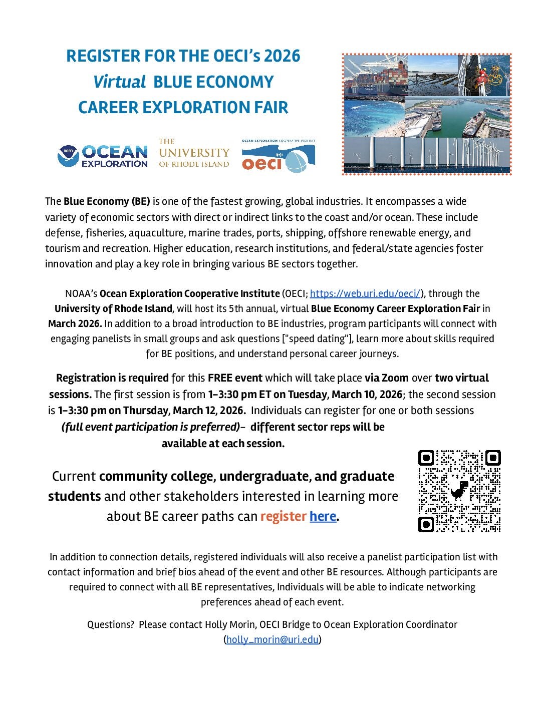 NOAA’s Ocean Exploration Cooperative Institute (OECI; https://web.uri.edu/oeci/), through the University of Rhode Island, will be hosting its 4rd annual Blue Economy Career Exploration Fair to raise awareness on diverse, BE employment opportunities. In addition to a broad introduction to BE industries, program participants will connect with engaging panelists in small groups and ask questions [“speed dating”], learn more about skills required for BE positions, and understand personal career journeys.