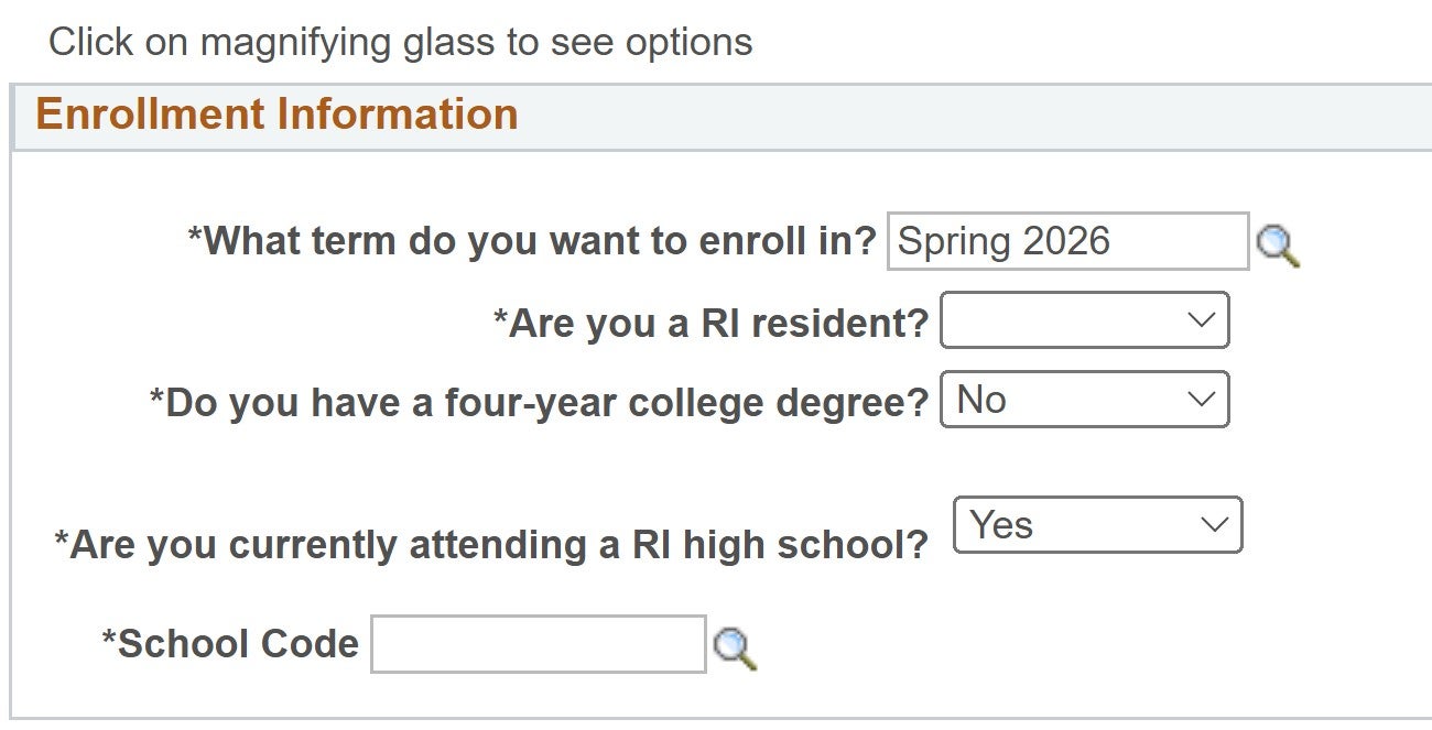 The term is referring to the semester that you plan to enroll. A RI resident is defined as a student who lives and attends a high school in the state of Rhode Island. The School Code is specific to your high school; use the magnifying glass to select your school.