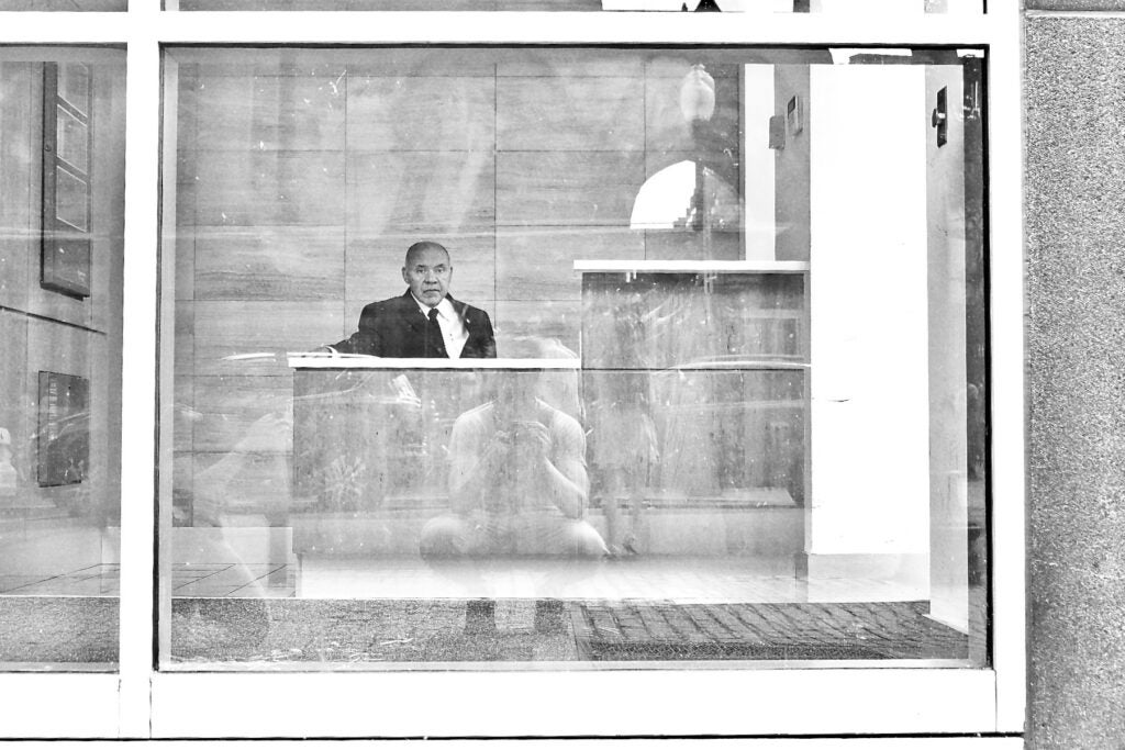 A photo of a guard behind his desk,