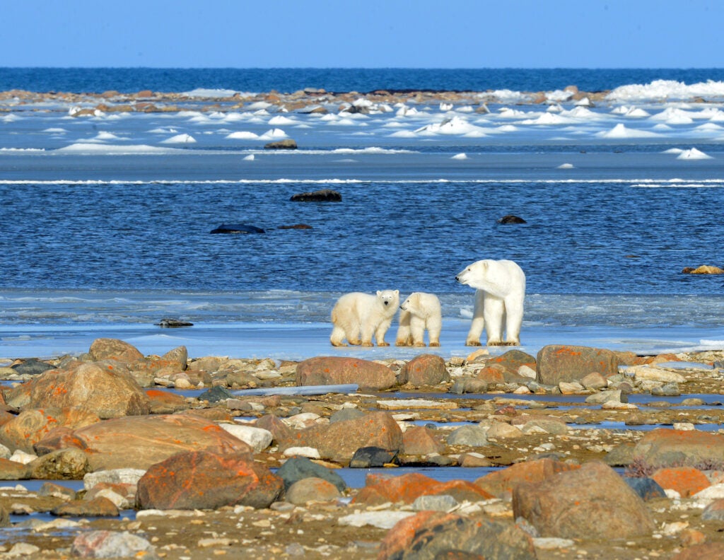 bear and her two cubs standing on the shores of Hudson Bay