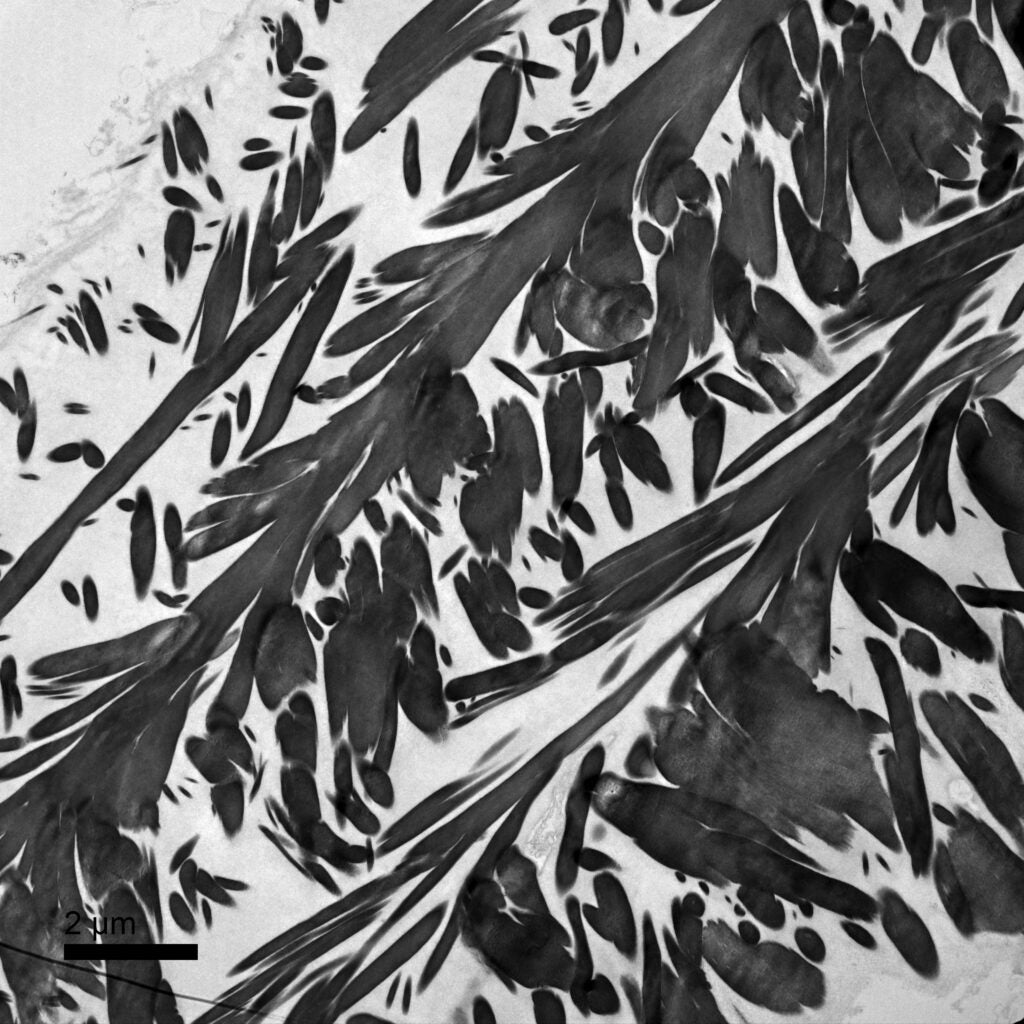 Mr. Kotachi’s research at URI is focused on developing autonomous underwater vehicles through bio-inspiration. This image is from a transmission electron micrograph showing the housing tube of a marine parchment worm. It shows a cross section of the material, made of highly organized nano-fibrils. These nano-fibrils are able to assemble rapidly underwater, making the material a potential template for novel 3D printing and underwater repair.