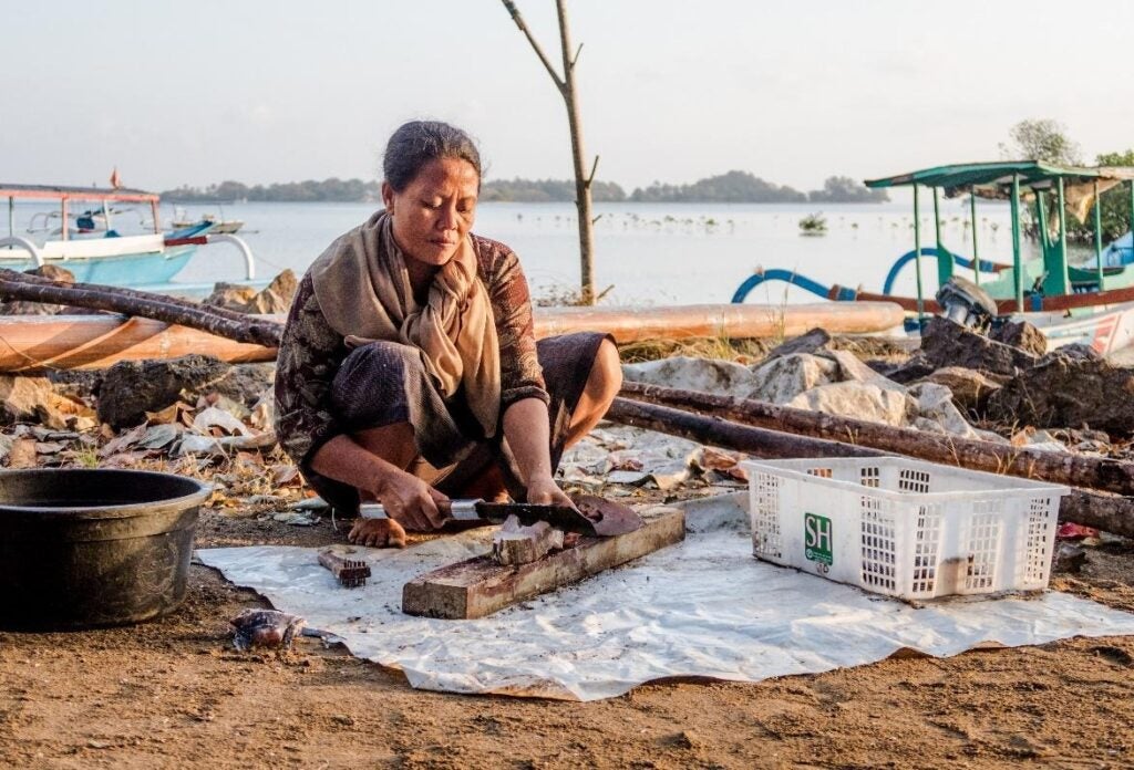 With the sunrise, a fisheries collector prepares a freshly-caught triggerfish for sale at the local market. As part of her research in Biological and Environmental Sciences, she was able to get a first-hand glimpse of how small-scale fisheries in Lombok, Indonesia operated, oftentimes meeting fishermen at landing sites as they arrived. Their boats were filled with colorful reef fish that were designated for personal consumption or sale, depending on the species.