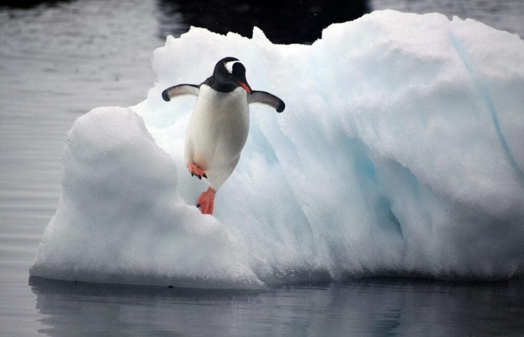 This photo was taken during an NSF-funded research cruise to the Antarctic to study how warming waters and disappearing sea ice as a function of rapid climate change are impacting the food webs supporting krill predators in the Southern Ocean. Penguins are “canaries in the coal mine” for the health of the ecosystem in order to better predict future responses to growing environmental change. This gentoo penguin leaps off a floating iceberg in the frigid waters of the Antarctic Peninsula in hopes of finding krill to eat while avoiding being eaten by a hungry leopard seal or killer whale.