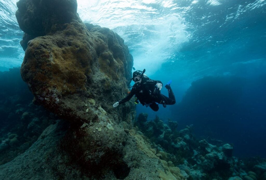 URI’s diving safety officer Anya Hanson captured this image while on a faculty-led program for AFS/ART 395- Underwater Photography and Film. Hanson says, “Students have the opportunity to learn advanced scuba diving techniques and acquire imagery in diverse environments from New England to the tropical-like waters of Bermuda,” where she took this photo. She adds, “The boiler reefs of Bermuda are named after the appearance of turbulent and boiling seawater. In this photo, a student descends next to a large boiler to explore, despite choppy conditions and surging water movement.”