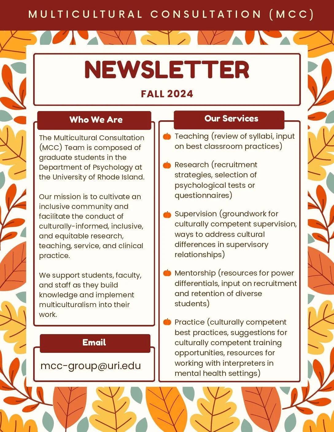 • The Multicultural Consultation (MCC) Team is composed of faculty and graduate students in the Department of Psychology at the University of Rhode Island.