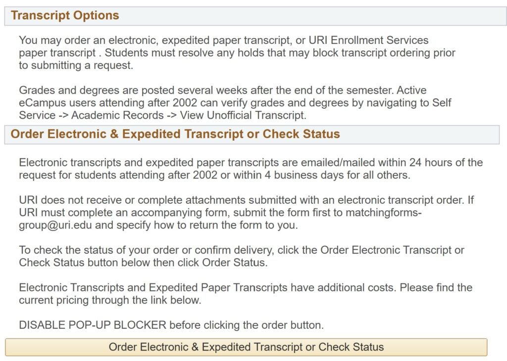 All eTranscript transactions through Parchment are subject to a processing fee. Please be sure to upload any attachments required by the recipient during the ordering process. These attachments will be sent directly to the recipient and will not be reviewed or completed by URI. The University is unable to upload your attachment(s).