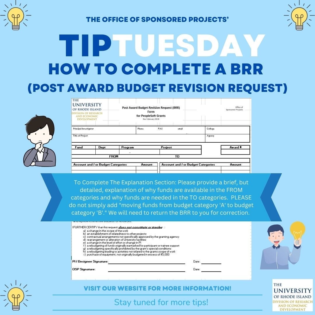 A Budget Revision Request (BRR) is a form used to request changes to the budget of a sponsored project. It requires an explanation, a signature, and certification from the Principal Investigator (PI) or designee that the request does not involve criteria that necessitate prior written approval from the agency. The revised costs should not be incurred or recorded until the BRR has been reviewed, approved, and processed by the Office of Sponsored Projects (OSP) Post Award Specialist. You can find your specialist at this link https://web.uri.edu/research-admin/research-admin/central-post-award-college-area-contact/