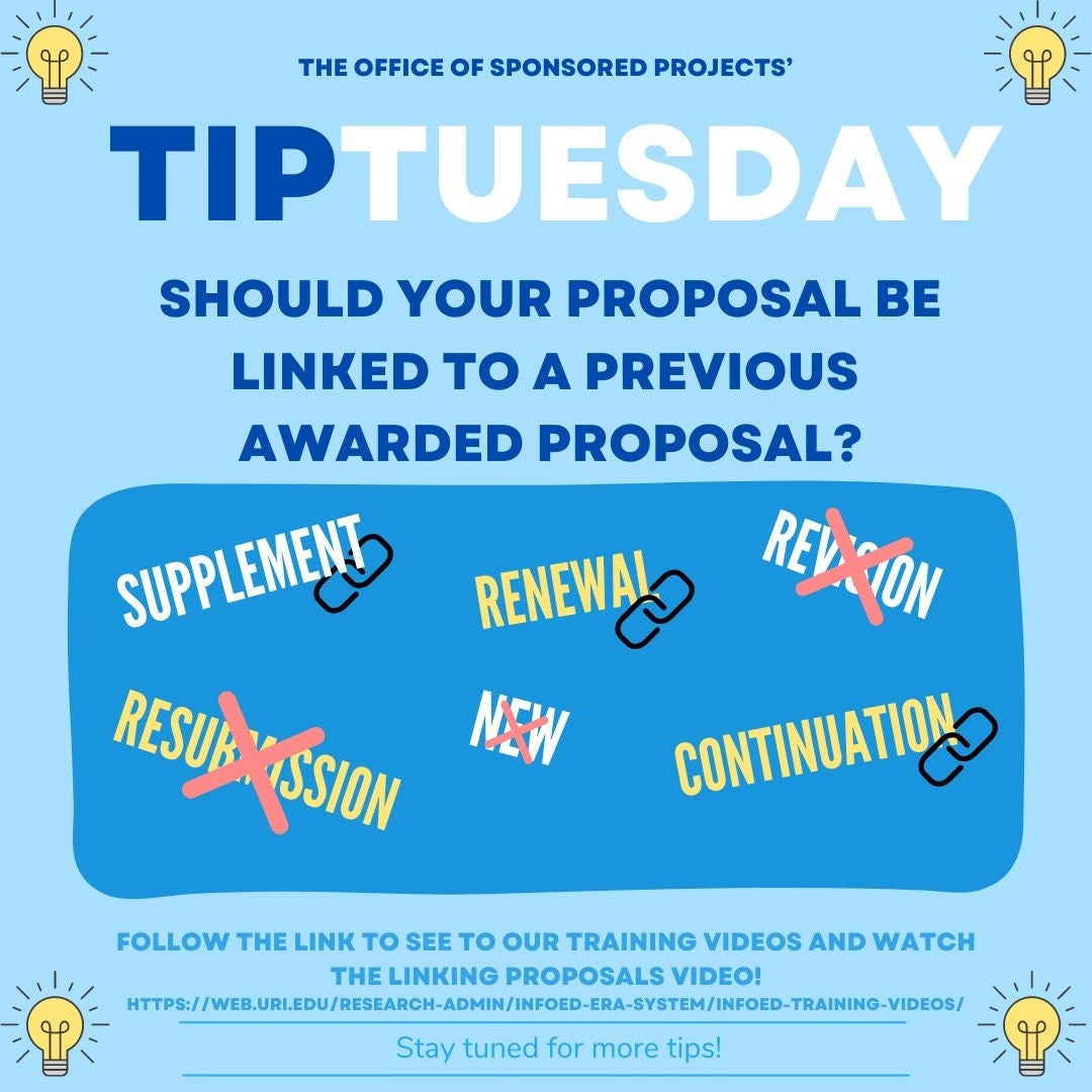 Linking proposals can be done swiftly and effortlessly with just a few clicks! Remember, if a proposal is awarded and shares the same Award Number, it must be linked back to the original proposal. This is particularly important for Supplement, Renewal, and Continuation Proposal types. Refer to April’s Tip Tuesday for definitions of proposal types. For more details, explore our training videos by following the link below, where you’ll find a specific video on how to link proposals.