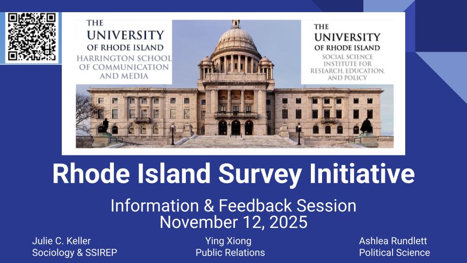 On Wednesday, November 12th, Dr. Ashlea Rundlett (Political Science), Dr. Ying Xiong (Harrington School of Communication), and Dr. Julie Keller (SSRIEP and Sociology) hosted a talk to introduce faculty to the Rhode Island Survey Initiative and share 2025 state polling results.